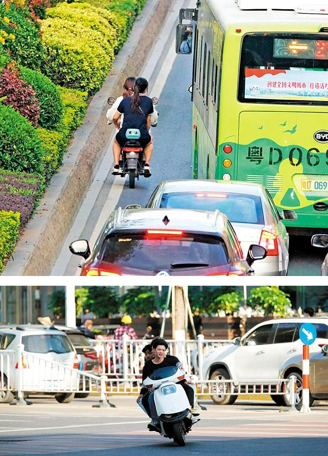 在龍眼路,有不少家長(zhǎng)駕駛電動(dòng)車(chē)搭載兒童,不但沒(méi)戴頭盔,有些還逆行或直接騎行在人行步道上。