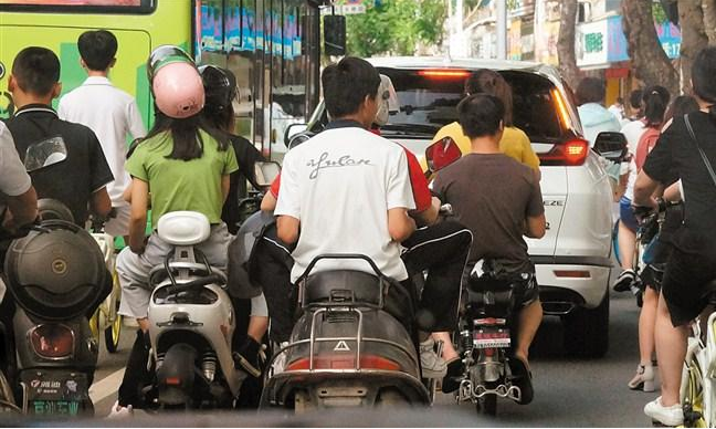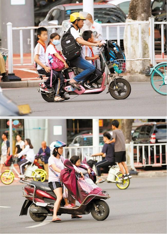 在上下學高峰時段,記者看到,許多家長騎著摩托車、電動車飛馳在接送小孩的路上。