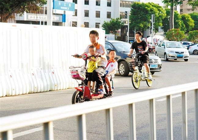 有的家長雖按要求佩戴了安全頭盔,卻未給乘坐的小孩佩戴頭盔;有的家長讓小孩落坐在非機動車的“前排”,騎行過程中,小孩或站或蹲,時而彈跳,十分危險;有的駕駛員在非機動車前后載了多位未成年人,不僅未做好防護措施,還與機動車搶道行駛……
