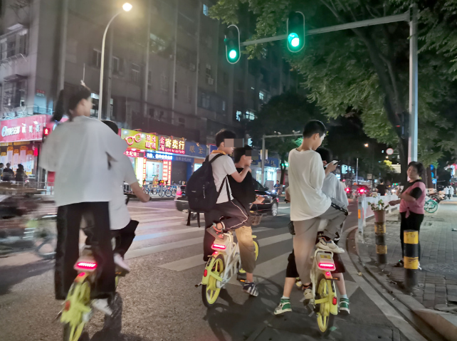 到了晚上,類似的“合騎”共享電單車的現(xiàn)象就更為多見,而更令人擔心的是,這樣騎車的人大多還是身穿校服的中學生。昨晚在市區(qū)長平路記者看到,許多孩子都選擇騎電單車結(jié)伴出行,他們有的是坐在車前的貨筐里,有的是一腳踩在鏈盤后部、一腳踏在單車尾架。有的孩子站在車架上搖搖晃晃,卻還不時低頭雙手在手機上操作。有的人甚至還在車上扭來晃去故意做出各種驚險的“雜技”動作,在車流中隨意搶道穿插,讓旁邊經(jīng)過的機動車駕駛員見狀都不得減速或是打方向避讓。