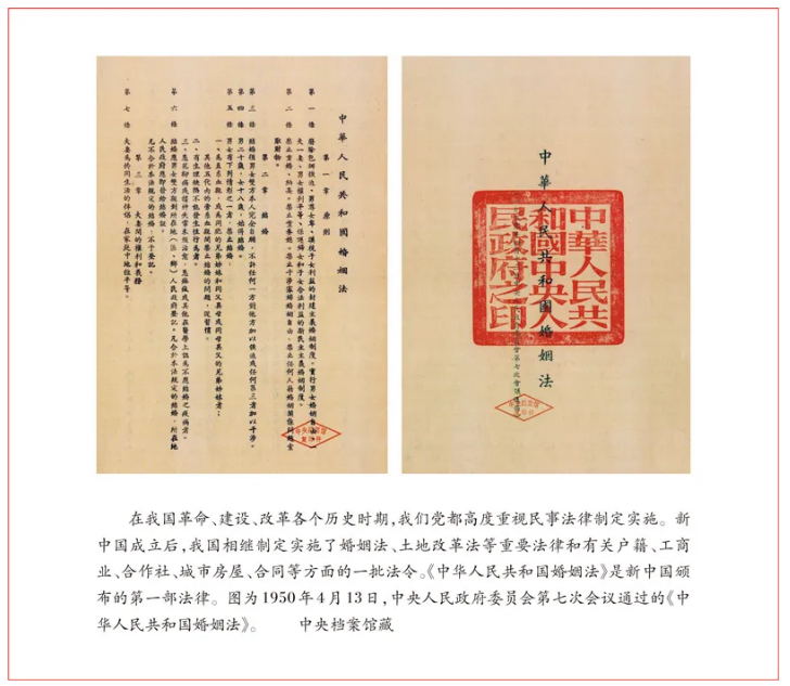 在我國革命、建設(shè)、改革各個(gè)歷史時(shí)期,我們黨都高度重視民事法律制定實(shí)施。革命戰(zhàn)爭年代,我們黨在中央蘇區(qū)、陜甘寧邊區(qū)等局部地區(qū)就制定實(shí)施了涉及土地、婚姻、勞動、財(cái)經(jīng)等方面的法律。新中國成立后,我國相繼制定實(shí)施了婚姻法、土地改革法等重要法律和有關(guān)戶籍、工商業(yè)、合作社、城市房屋、合同等方面的一批法令。我們黨還于1954年、1962年、1979年、2001年4次啟動制定和編纂民法典相關(guān)工作,但由于條件所限沒有完成。