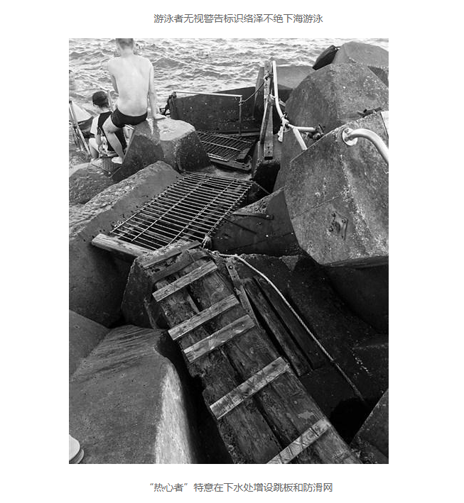 一位喜歡戶外活動的市民告訴記者,以前不少人喜歡在海灣大橋下的海里游泳,但自從有人“發(fā)現(xiàn)”東海岸大道新津河出??诟浇@個水質(zhì)更好的地方后,現(xiàn)在大部分人都已經(jīng)轉(zhuǎn)移到新地點游泳了。熟悉水性的人說,這里不僅沒有海灣大橋下湍急的水流,而且還不用擔心和小漁船相遇。所以不僅轉(zhuǎn)移來這里人數(shù)越來越多,而且還有人專門對下水點進行了改造,搭建更多方便行走的長木板,并鋪設(shè)鐵絲網(wǎng)以防有人腳滑失足,踏空墜海。