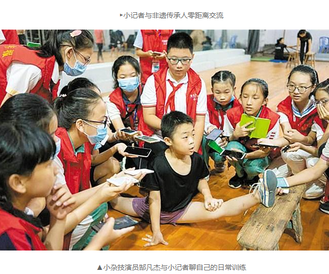 在雜技團(tuán)訓(xùn)練基地,小雜技演員郜凡杰接受了小記者們的采訪,他的故事讓大家感動(dòng)。郜凡杰雖然年僅9歲,但遠(yuǎn)離家鄉(xiāng)四川來(lái)汕學(xué)習(xí)雜技已有很長(zhǎng)時(shí)間,每天練功七、八個(gè)小時(shí),這讓小記者陳璽喬覺(jué)得驚訝,“但郜凡杰告訴我們,雖然辛苦,但為了舞臺(tái)上的效果都值得。我很佩服9歲的他,勇敢頑強(qiáng),像個(gè)懂事的小大人?!薄澳敲炊鄮缀醪豢赡茏龅降膭?dòng)作,他們居然都完成了!”探營(yíng)前,小記者陳仲凱很好奇,他們是怎么做到的?采訪中,大演員小演員不約而同給出答案——因?yàn)闊釔?ài)而堅(jiān)持?!罢沁@份堅(jiān)持與熱愛(ài)的激勵(lì),他們才能不斷前進(jìn),因?yàn)闊釔?ài),所以堅(jiān)持;因?yàn)閳?jiān)持,所以熱愛(ài)!”陳仲凱說(shuō)。