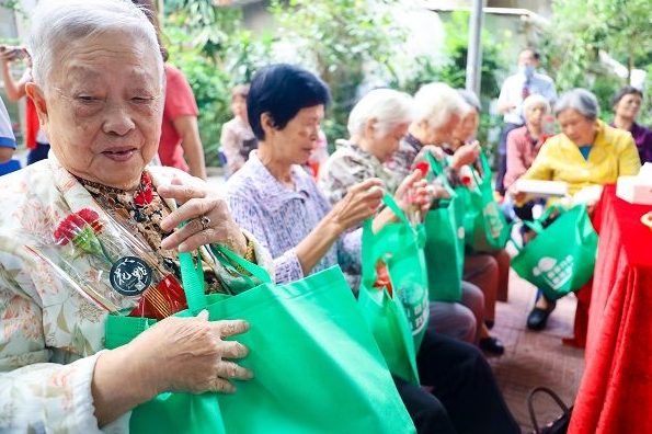 本次活動分為上下半場,上半場為“點燃夕陽?活出耆彩”為主題的座談交流活動,各單位代表紛紛向社區(qū)長者獻上節(jié)日祝福,或是高歌,或是獻詩,或是小朋友們對爺爺奶奶們的誠摯問候,現(xiàn)場氣氛逐漸升溫。隨后邀請金珠潮樂隊進行演奏,大家一邊觀看表演、聆聽樂曲,一邊品嘗糕點、互動交流,現(xiàn)場工作人員還為老年朋友們獻上精心準備的長壽面、香包、鮮花等節(jié)日慰問品,切實營造了歡樂祥和的節(jié)日氣氛。