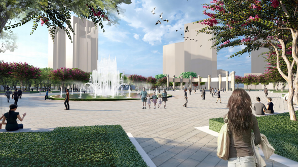 東側(cè)城市活力軸:保留原人民廣場柱廊及音樂噴泉,沿中心廣場周邊增加開花喬木,并設(shè)置休息坐凳,打造繽紛活力的城市氛圍。?