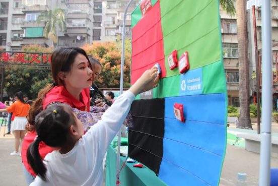 社區(qū)志愿者指著分類(lèi)垃圾游戲轉(zhuǎn)盤(pán)上的“紙箱”,向參加游戲的孩子提問(wèn),孩子一下子就回答出來(lái)。隨后,孩子又通過(guò)轉(zhuǎn)盤(pán)上的內(nèi)容,分別說(shuō)出它們屬于什么垃圾。志愿者們熱情地向前來(lái)參加活動(dòng)的居民講解垃圾分類(lèi)投放知識(shí),讓居民在家中更簡(jiǎn)單便捷地進(jìn)行垃圾分類(lèi)。