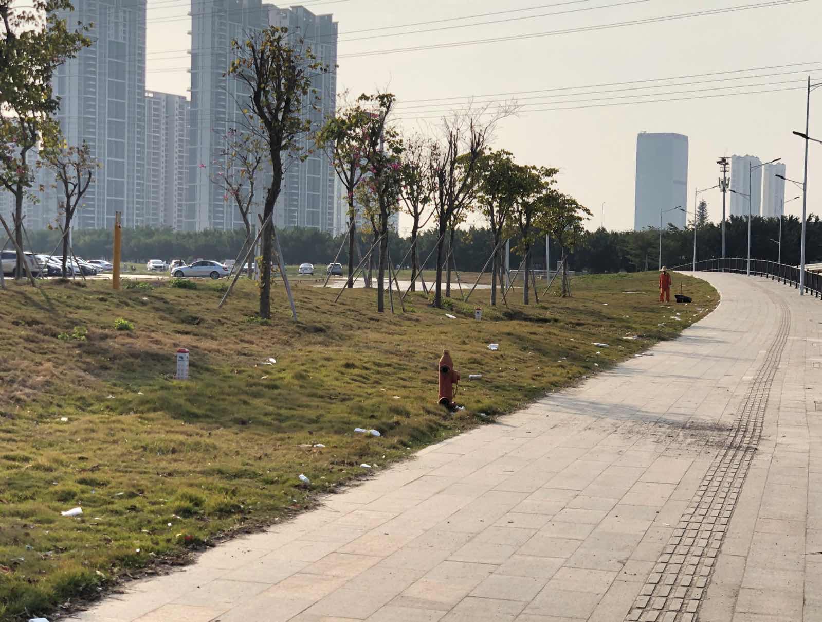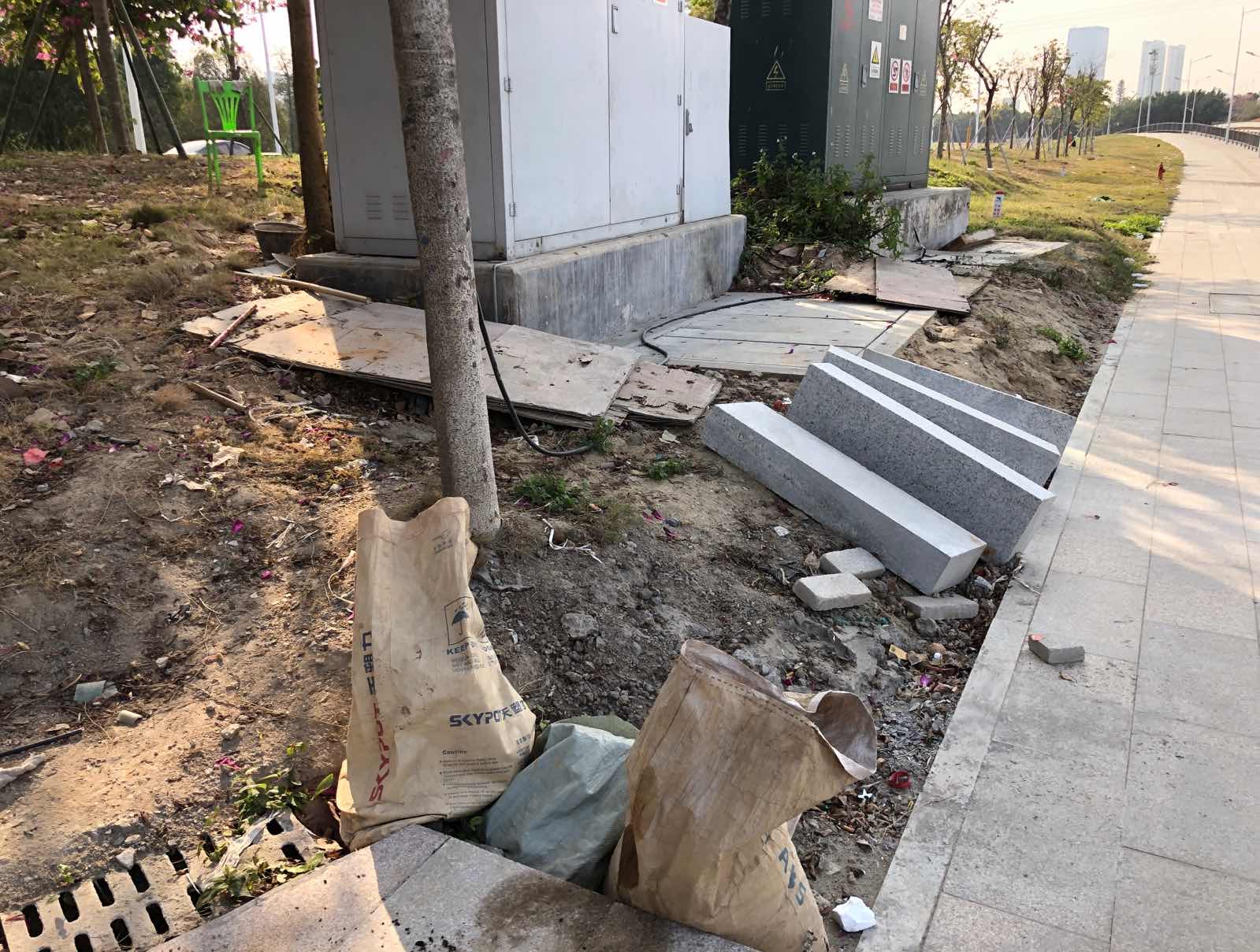 靠近中陽大道一側(cè)的綠化帶垃圾、雜物遍地,石頭、廢土、木材、紙屑、飲料瓶、塑料泡沫未及時清理。綠化帶有樹木掛著拖把,周邊多處草地沙土裸露。