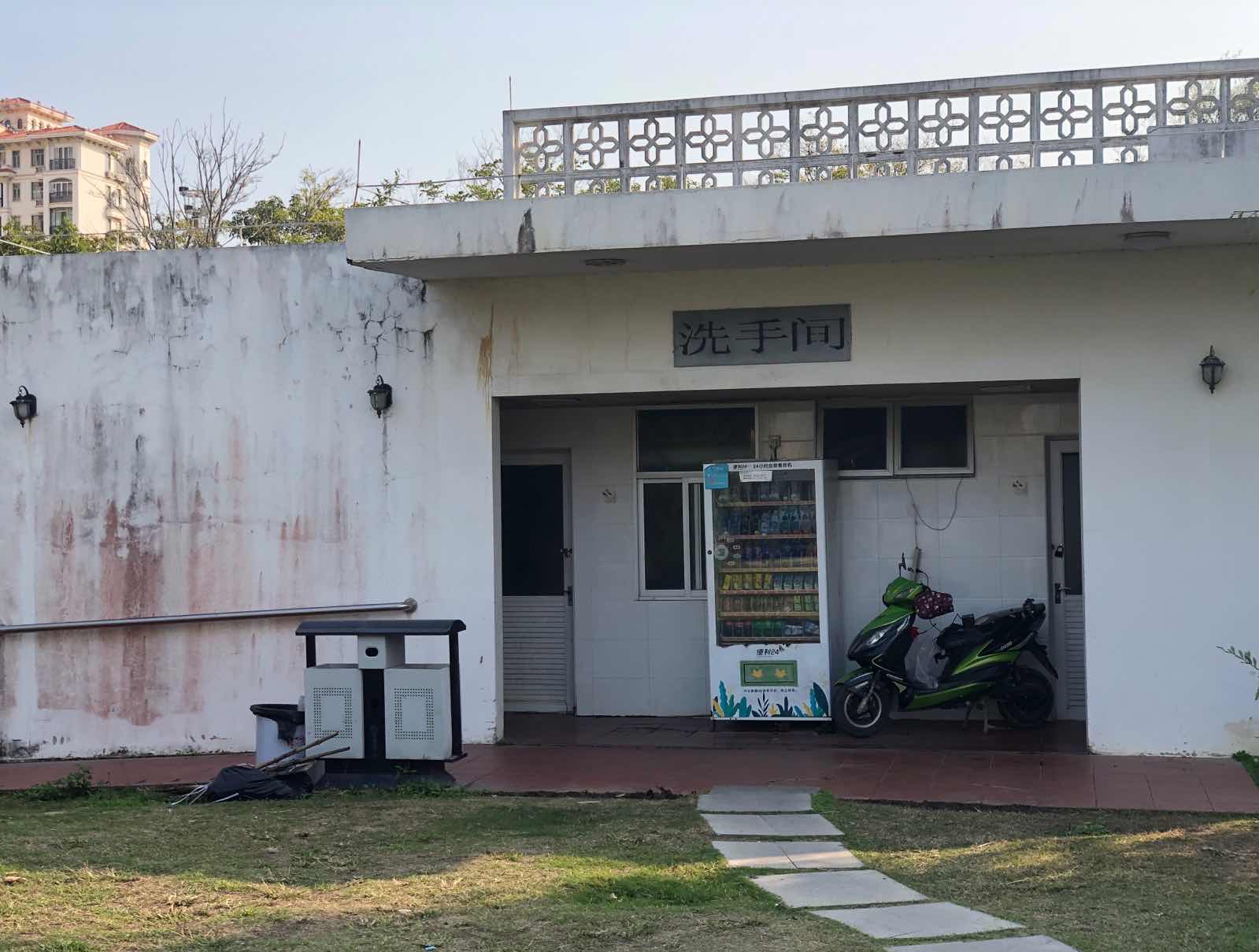 公園內(nèi)一處洗手間門口停著的一輛電動摩托車?yán)孟词珠g電源充電。