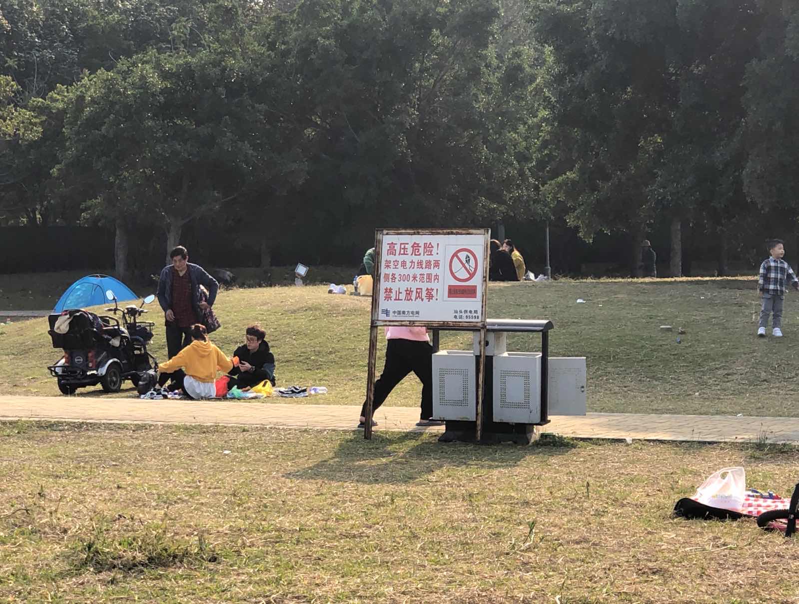 多處垃圾桶旁堆有垃圾雜物未清理。草坪上有不少市民游客鋪著席子、架起椅子、搭著帳篷,用明火煮水泡茶,多處有垃圾落地。草坪上豎立著“禁止放風(fēng)箏”的牌子,但仍有市民游客在草坪上放風(fēng)箏。