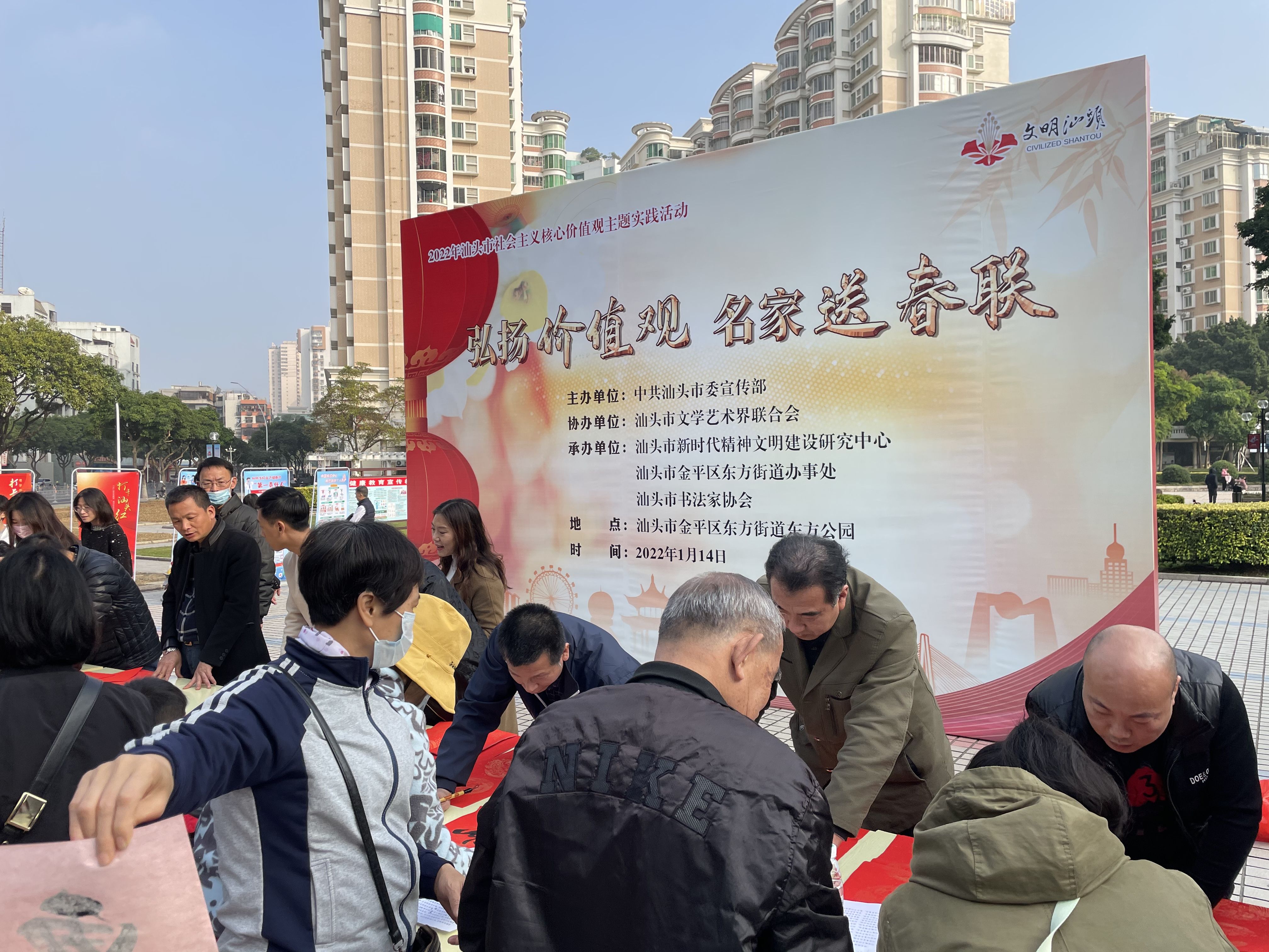 2022年春節(jié)將至,為弘揚社會主義核心價值觀,傳承優(yōu)秀傳統(tǒng)文化,宣傳黨的十九屆六中全會精神,豐富群眾節(jié)日文化生活,營造喜慶、祥和、文明的節(jié)日氛圍,1月14日下午,由市委宣傳部主辦,市新時代精神文明建設研究中心、東方街道辦事處、市書法家協(xié)會承辦,市文聯協(xié)辦的“弘揚價值觀 名家送春聯”主題活動在金平區(qū)東方公園開展。