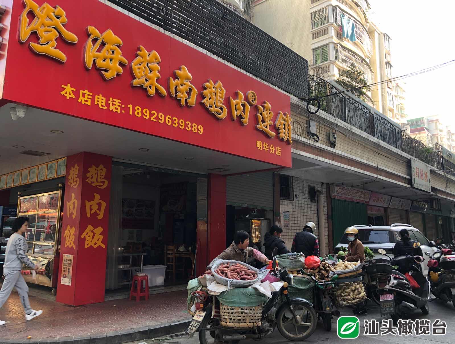 ◆“澄海蘇南鵝肉連鎖”門口有流動(dòng)攤販占道售賣蔬菜,對(duì)面一家水果茶葉批發(fā)店將貨物擺放在人行步道,影響行人通行。