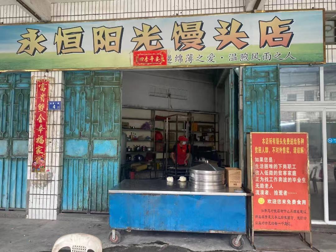 饅頭店門口的紅色招牌上赫然寫著:“本店所有饅頭免費送給各種貧困人群,不對外售賣,請諒解。如果您是生活困難的下崗職工、收入低微的貧寒家庭、正在為找工作奔波的畢業(yè)生、無助老人、流浪者、拾荒者……歡迎您來免費食用。”